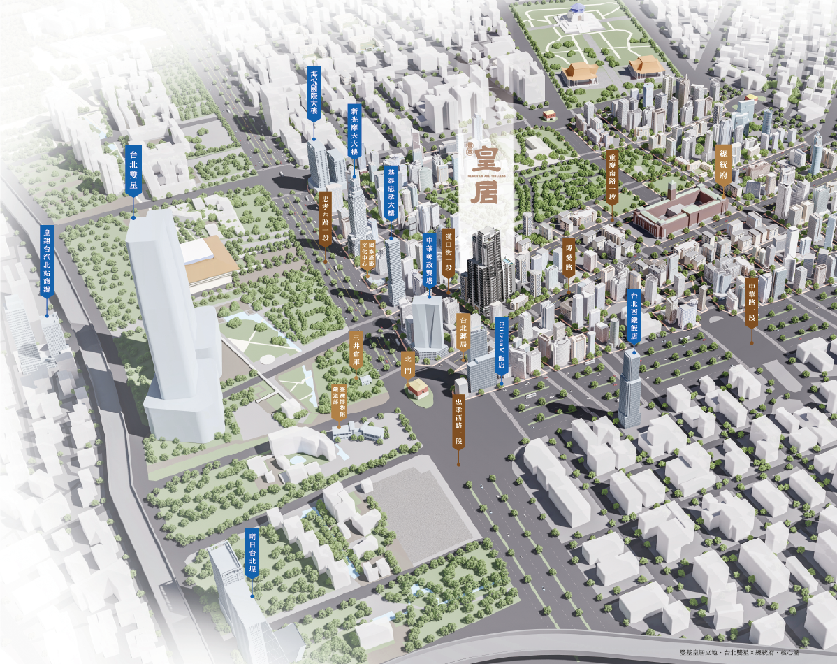 台北城心群山羅列,淡水河、新店溪二水環抱;相映未來雙星,開啟西區門戶。群山、總統府、豐基皇居、未來雙星-帝王軸線,就此縱橫台北城。